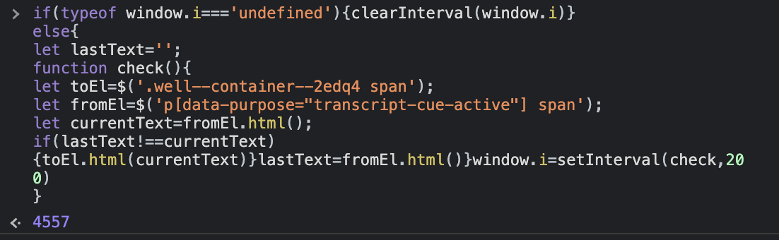 if(typeof window.i==='undefined'){clearInterval(window.i)} else{ let lastText=''; function check(){ let toEl=$('.well--container--2edq4 span'); let fromEl=$('p[data-purpose="transcript-cue-active"] span'); let currentText=fromEl.html(); if(lastText!==currentText){toEl.html(currentText)}lastText=fromEl.html()}window.i=setInterval(check,200) }아래와 같이 결과가 숫자로 나오면 성공입니다.