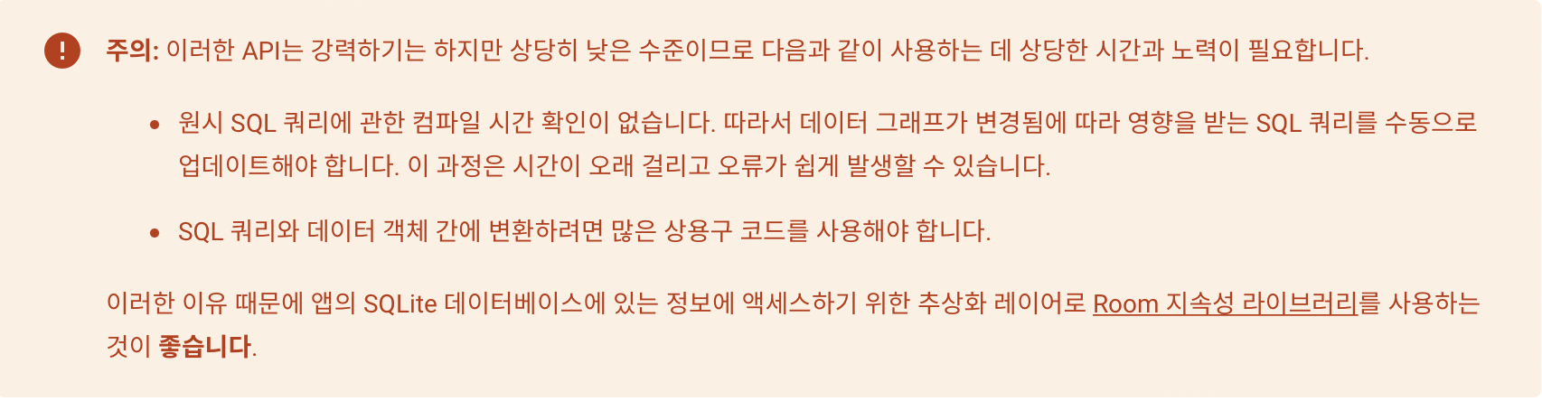 - 위에 나오는 안드로이드 문서에서처럼 SQLite는 쿼리의 컴파일 시간 검증을 할 수 없습니다. 반면에 Room 라이브러리 같은 경우 컴파일 타임에 SQL 유효성 검사가 있습니다.