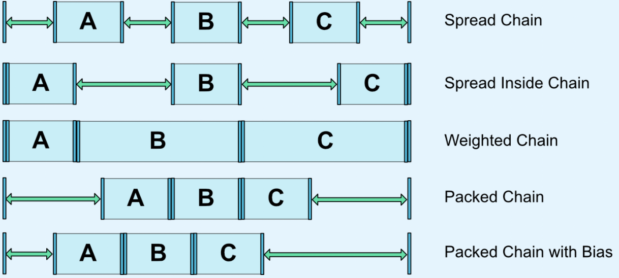 - CHAIN_PACKED : 체인의 요소가 함께 포장됩니다. 그러면 자식의 수평 또는 수직 편향 속성이 패킹된 요소의 위치에 영향을 줍니다.