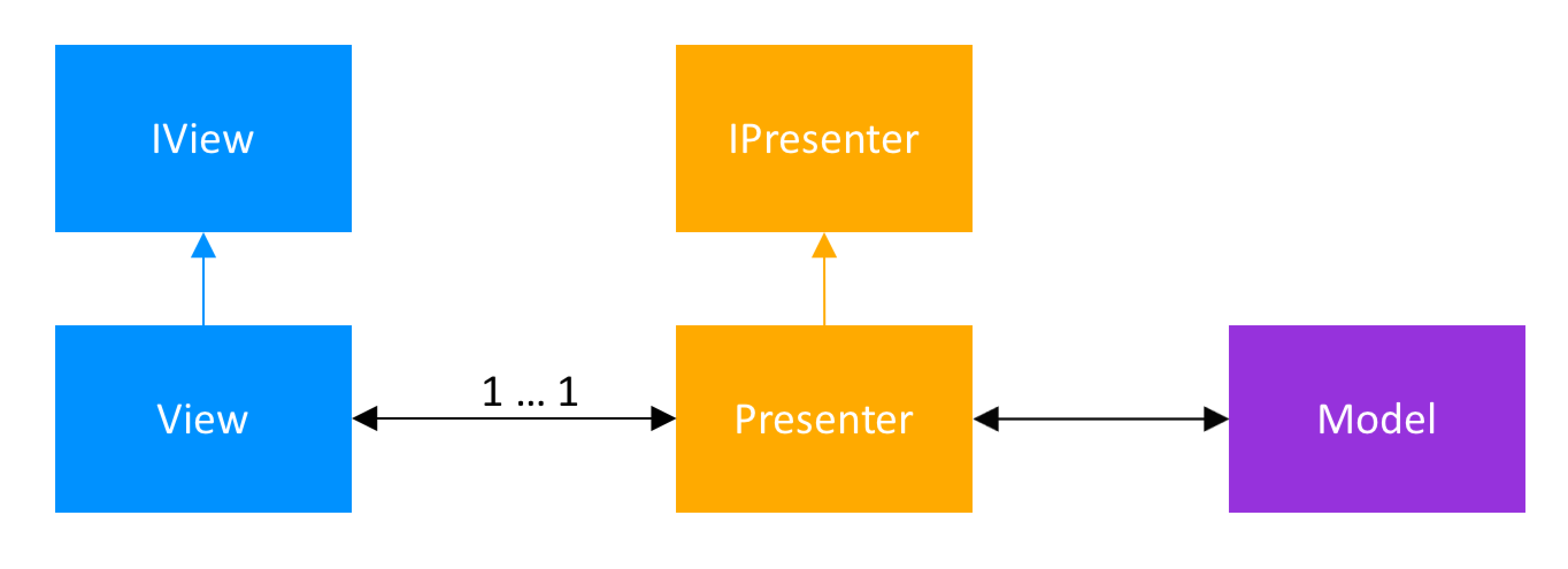Presenter는 View와 Model의 인스턴스를 가지고 있어 둘을 연결하는 역할을 합니다. Presenter와 View는 1:1 관계입니다. 단순 Interface이기 때문에 테스트가 용이하고 모듈화/유연성 문제가 해결된다는 특징이 있습니다.