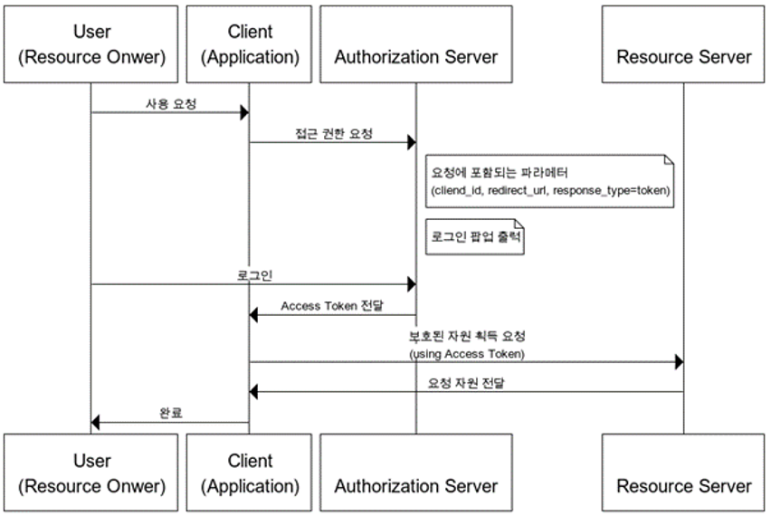 : 권한 부여 코드 승인 방식과 유사하지만 차이점이 권한 코드 교환 단계 없이 Access Token을 즉시 반환해 이를 인증에 이용하는 방식.